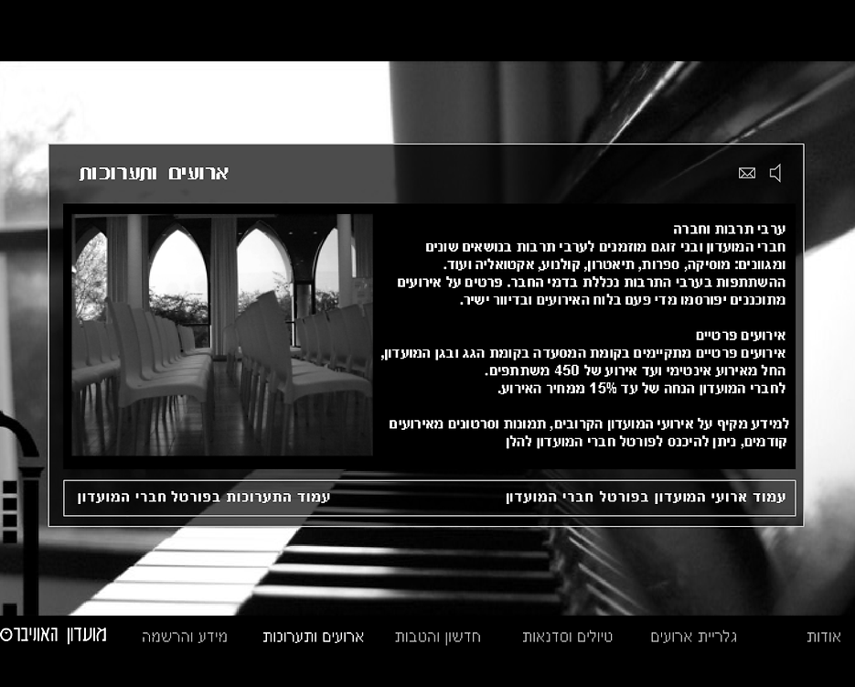 The Tel-Aviv University Faculty Club website was built using Flash technology including animated contents. The website was designed in such a way that the viewer and view the galleries of various events held at the club, as well as the event videos.